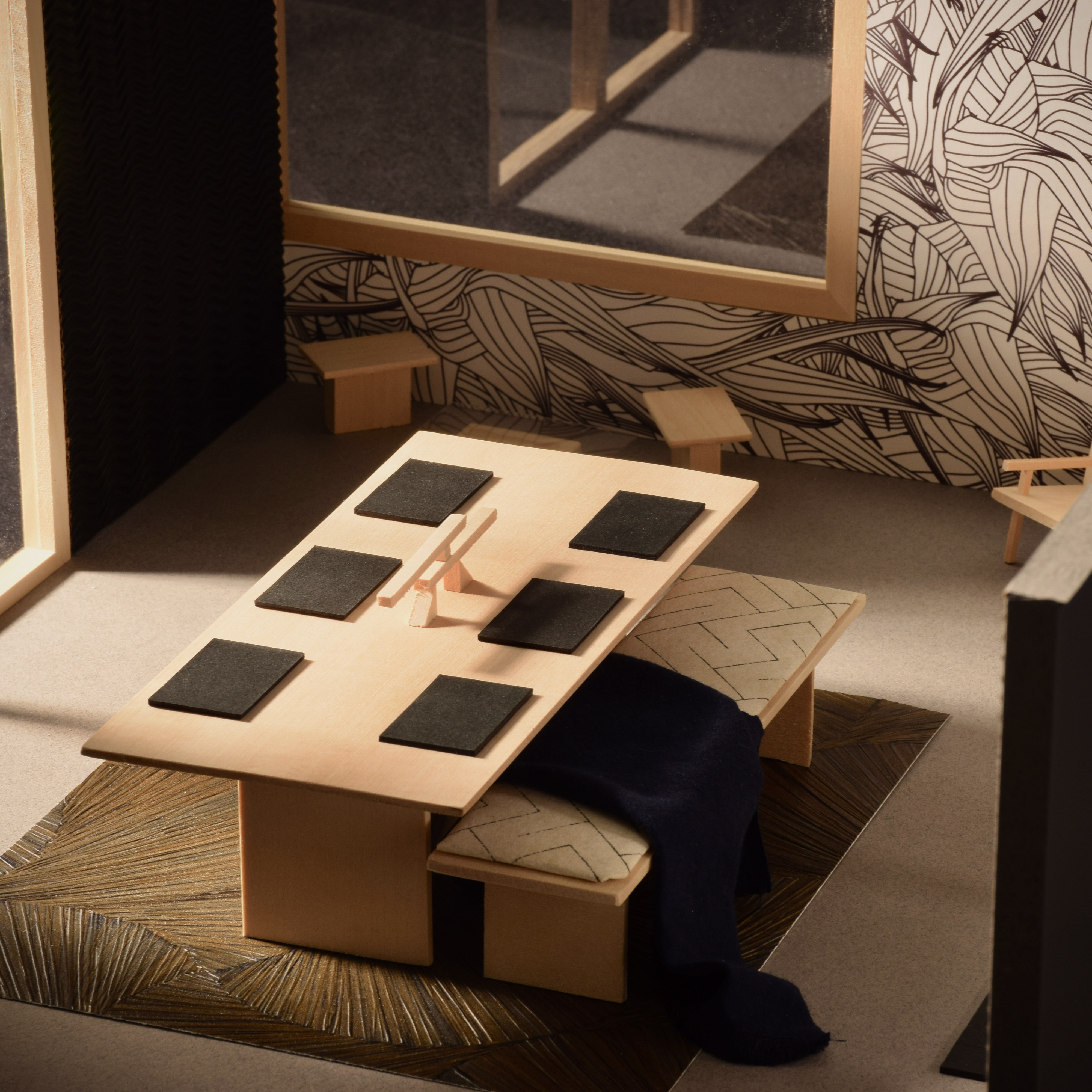 a materiality and modular furniture study in a combined dining + living area. a precursor for the 'common ground' studio project