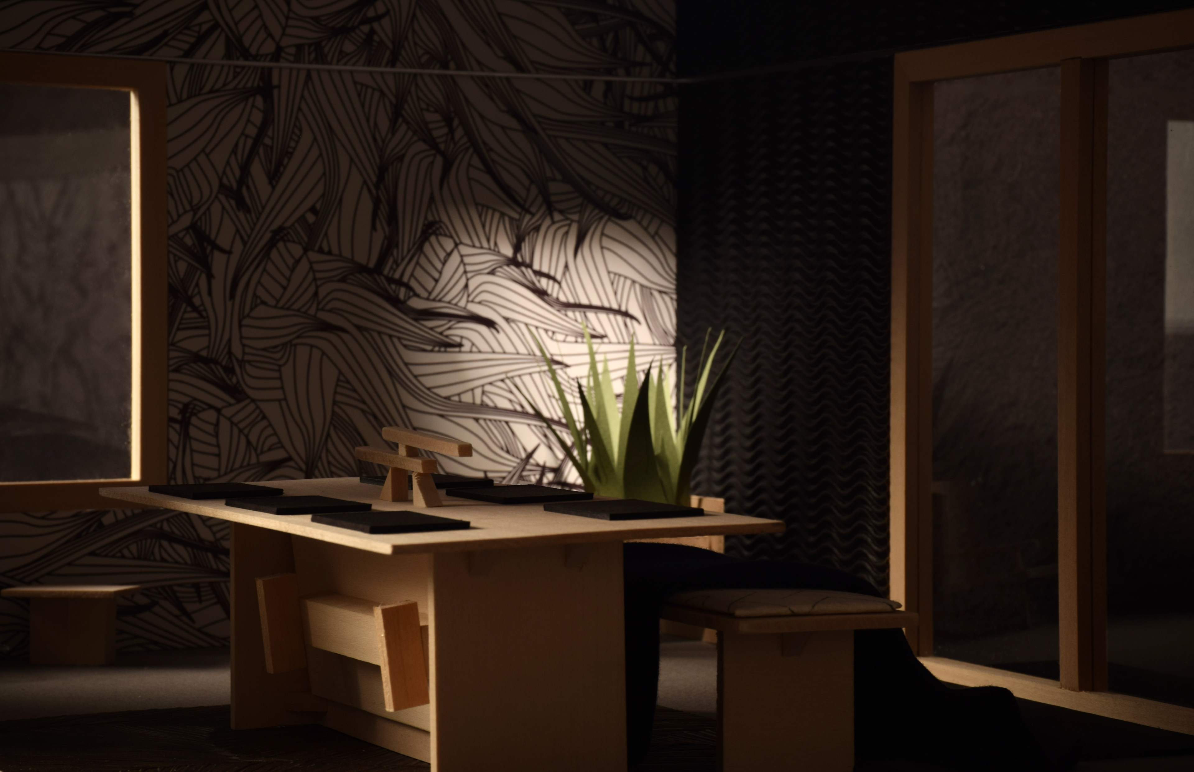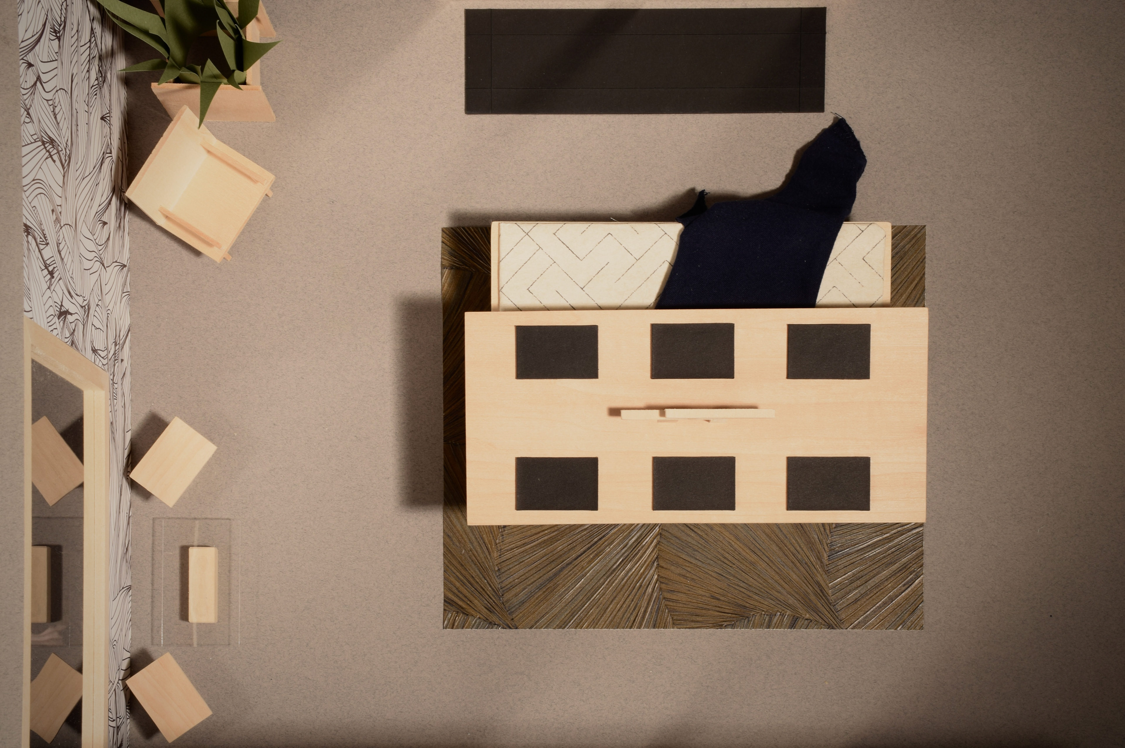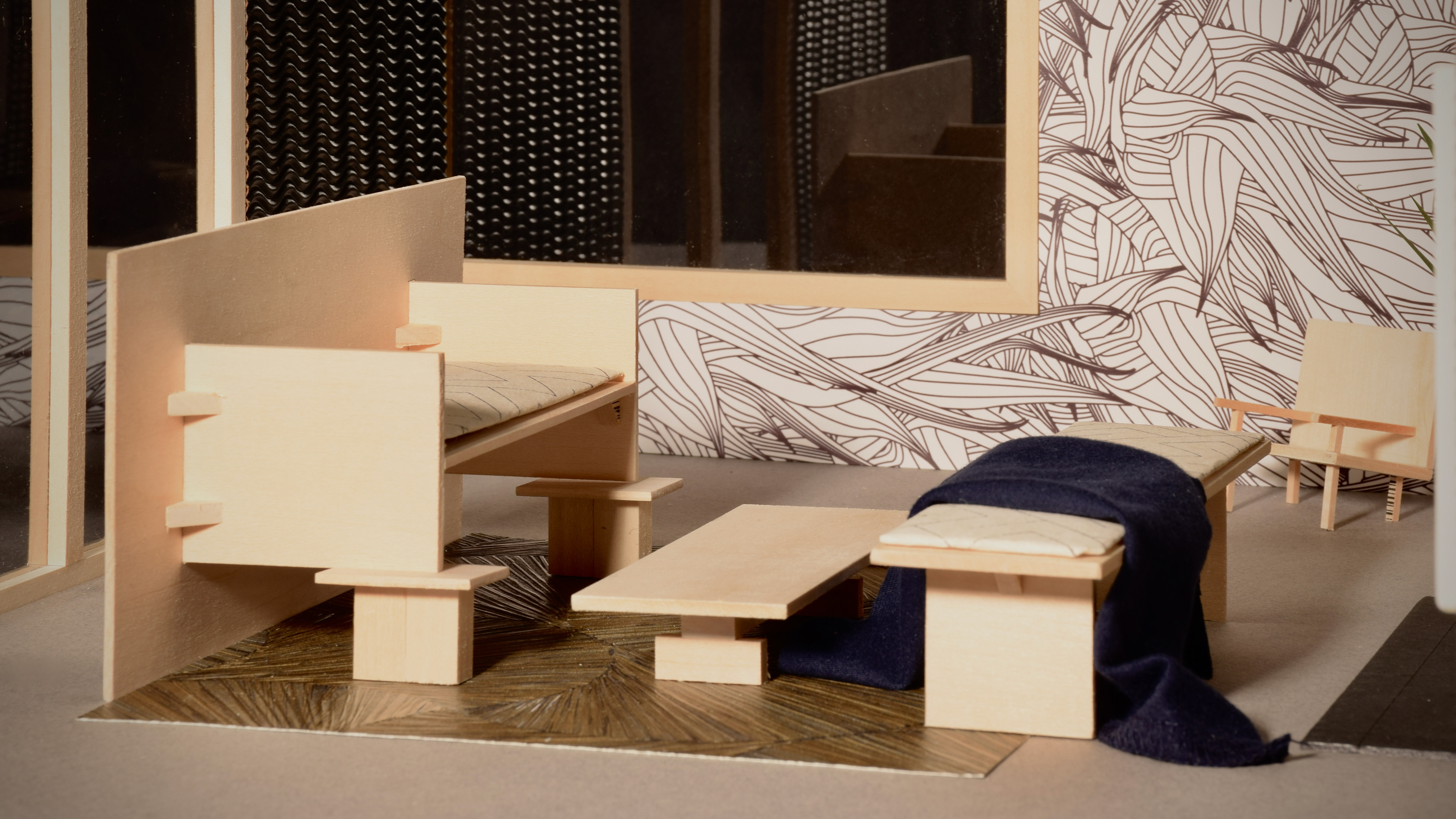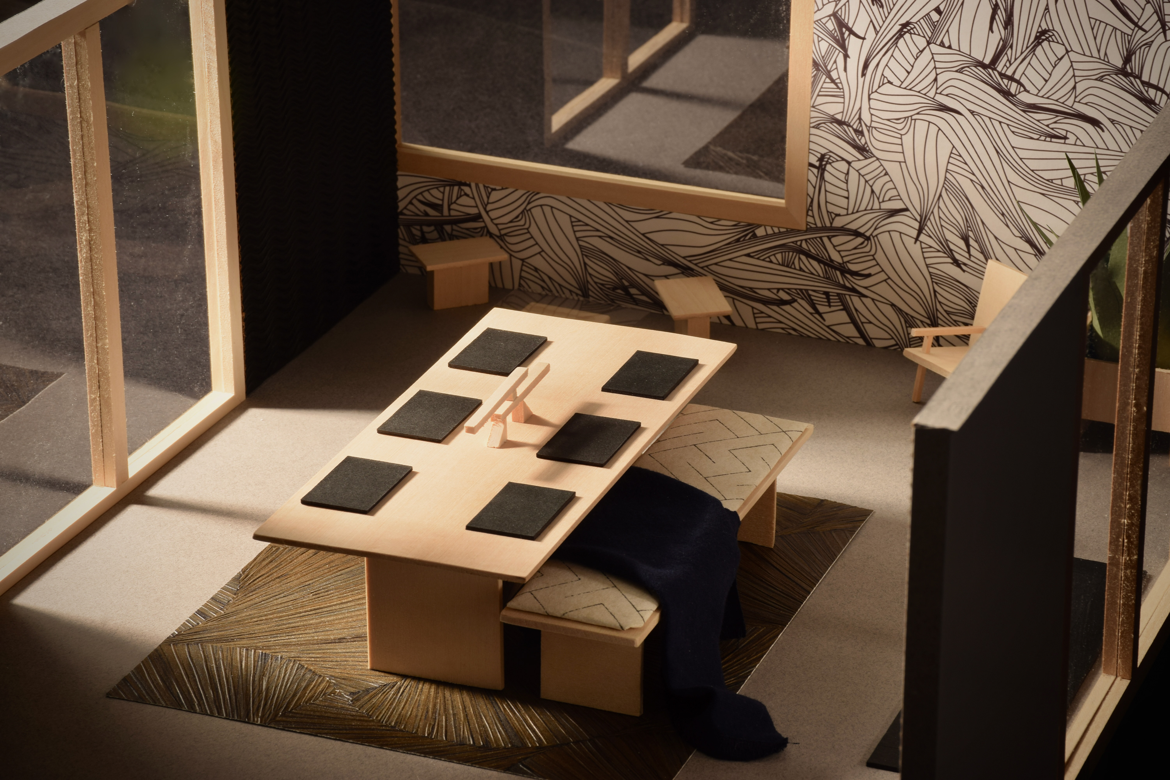 using a single room from pezo von ellrichshausen's 'parr house', this small project aims to use modular furniture and a combination of complementary materials to create a space equally suited for living and dining.
