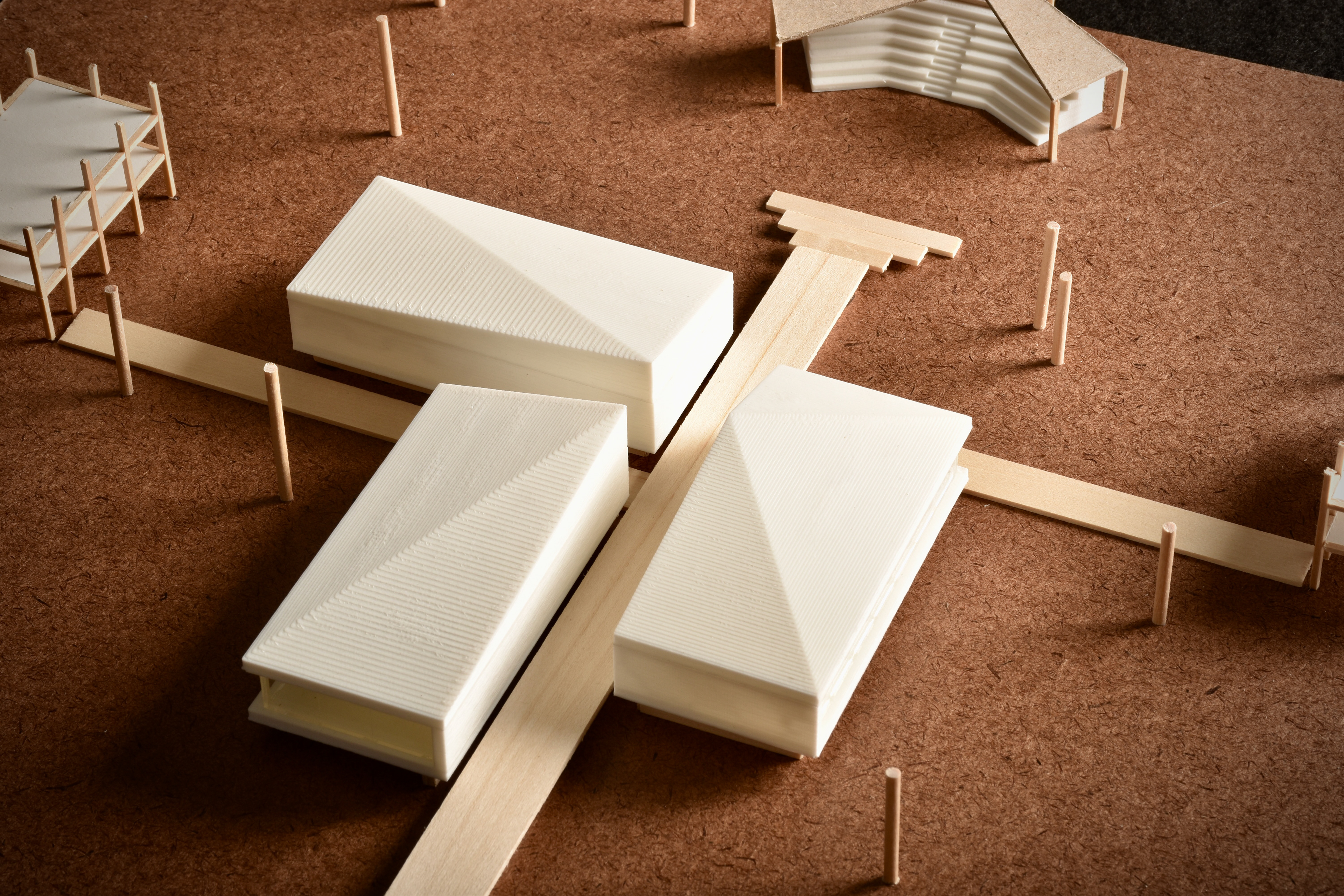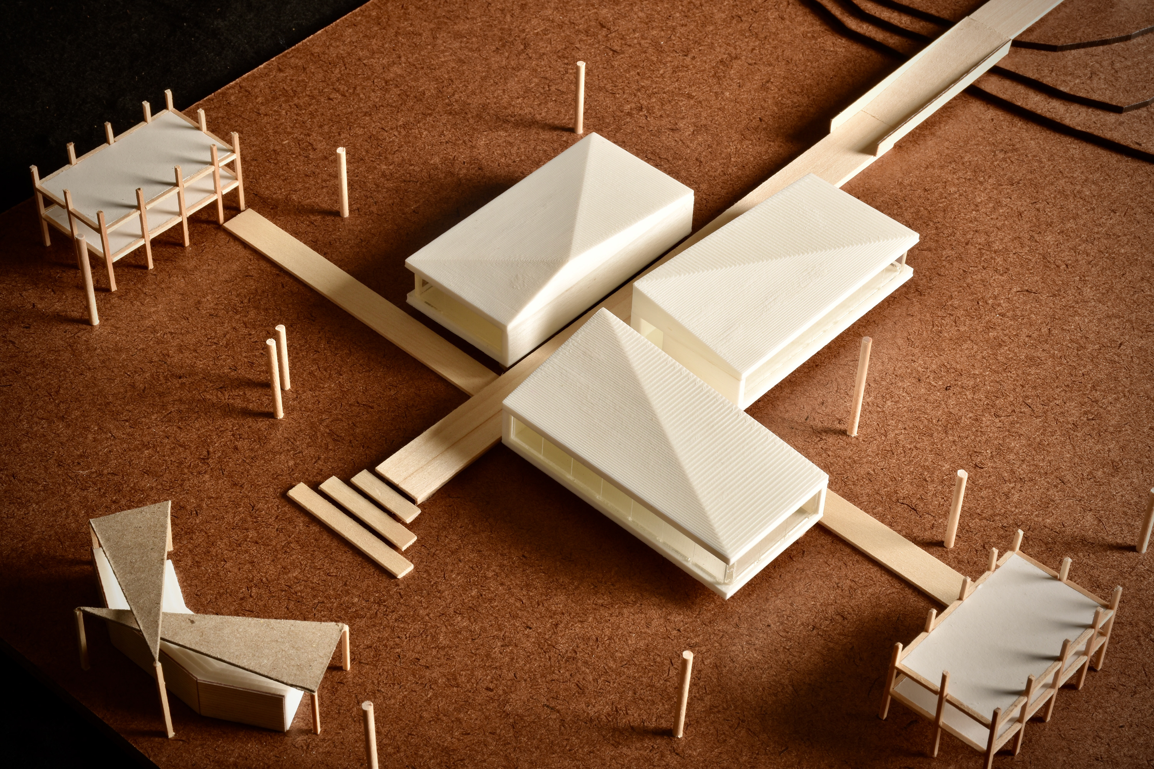 model photograph. each roof apex of the 'core' buildings comes together to create an area to pause and look around, with no destination being incorrect.